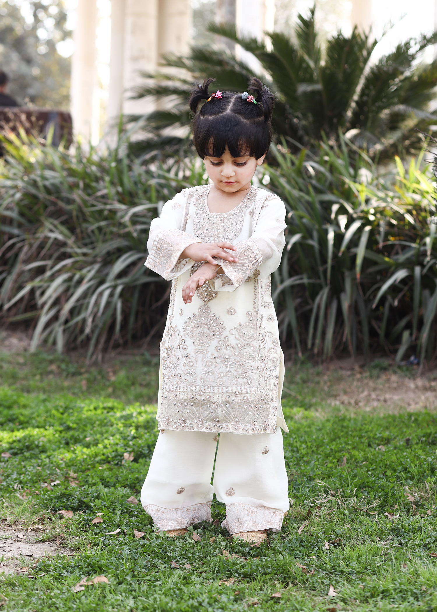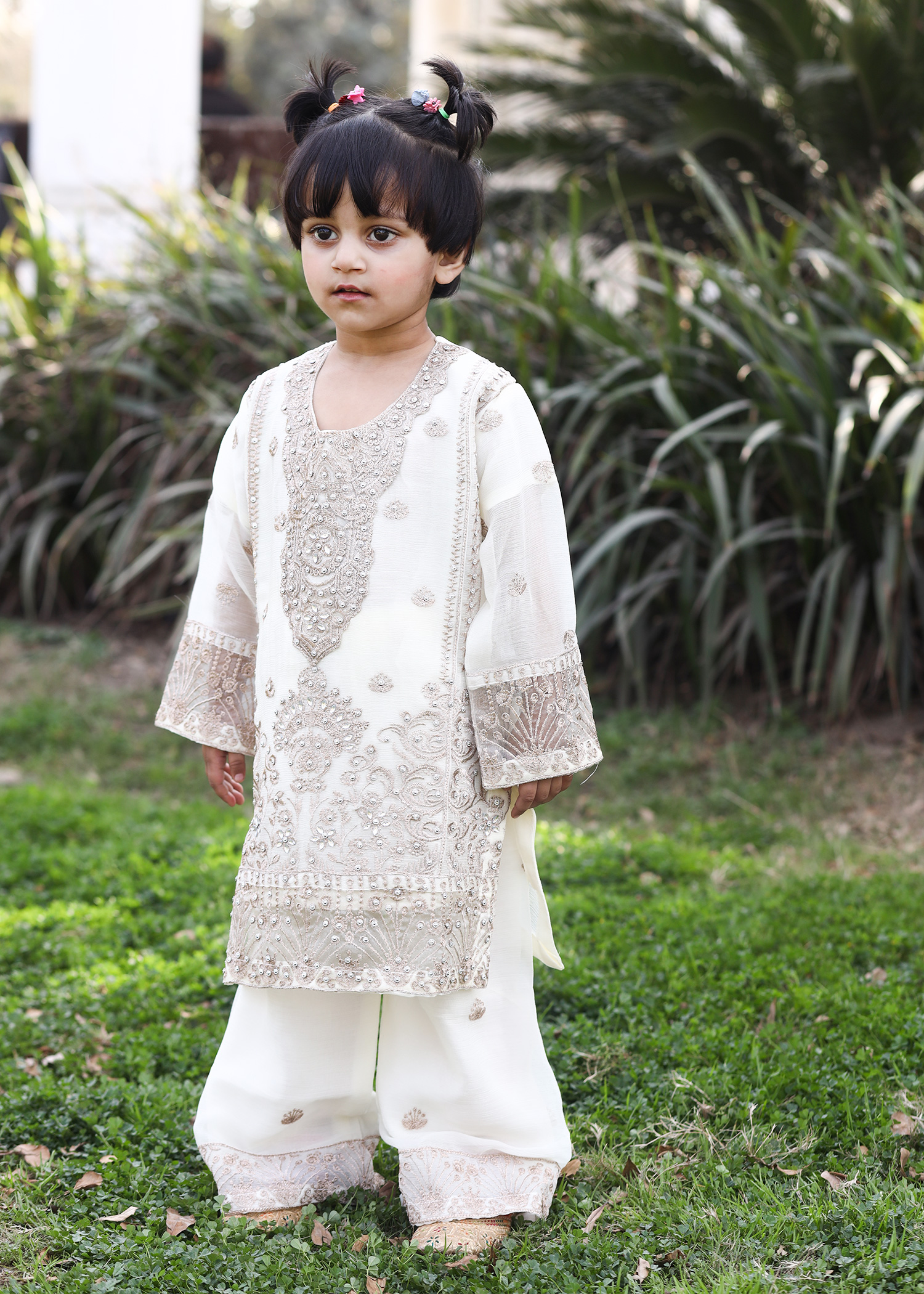 Let your little girl shine with elegance in our Ivory Bloom Kids White Embroidered 3 Piece Kurta Set by Sutar. Designed in premium chiffon fabric, this graceful outfit features a straight cut embroidered kurta paired with a stylish flapper trouser and a matching chiffon dupatta.