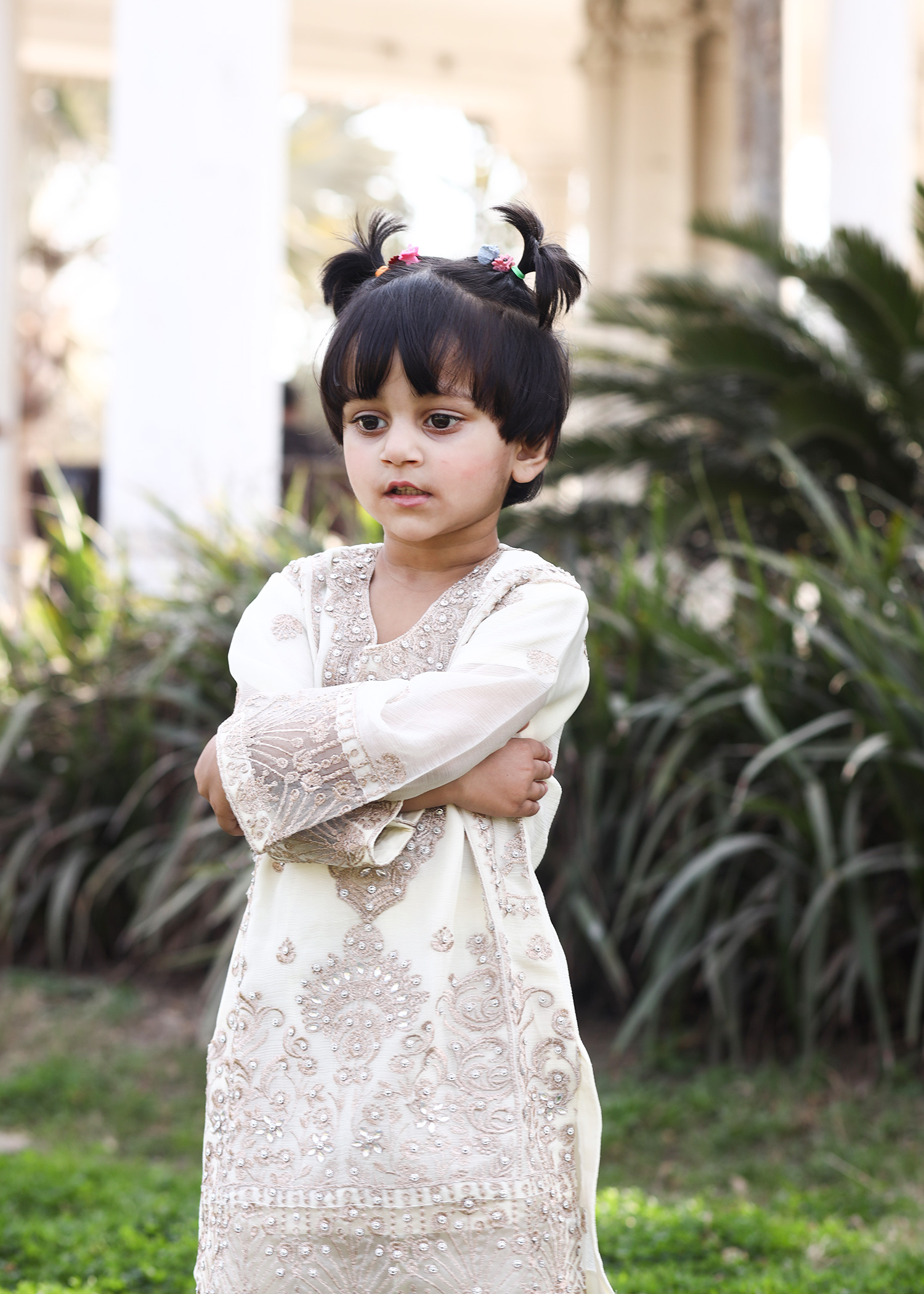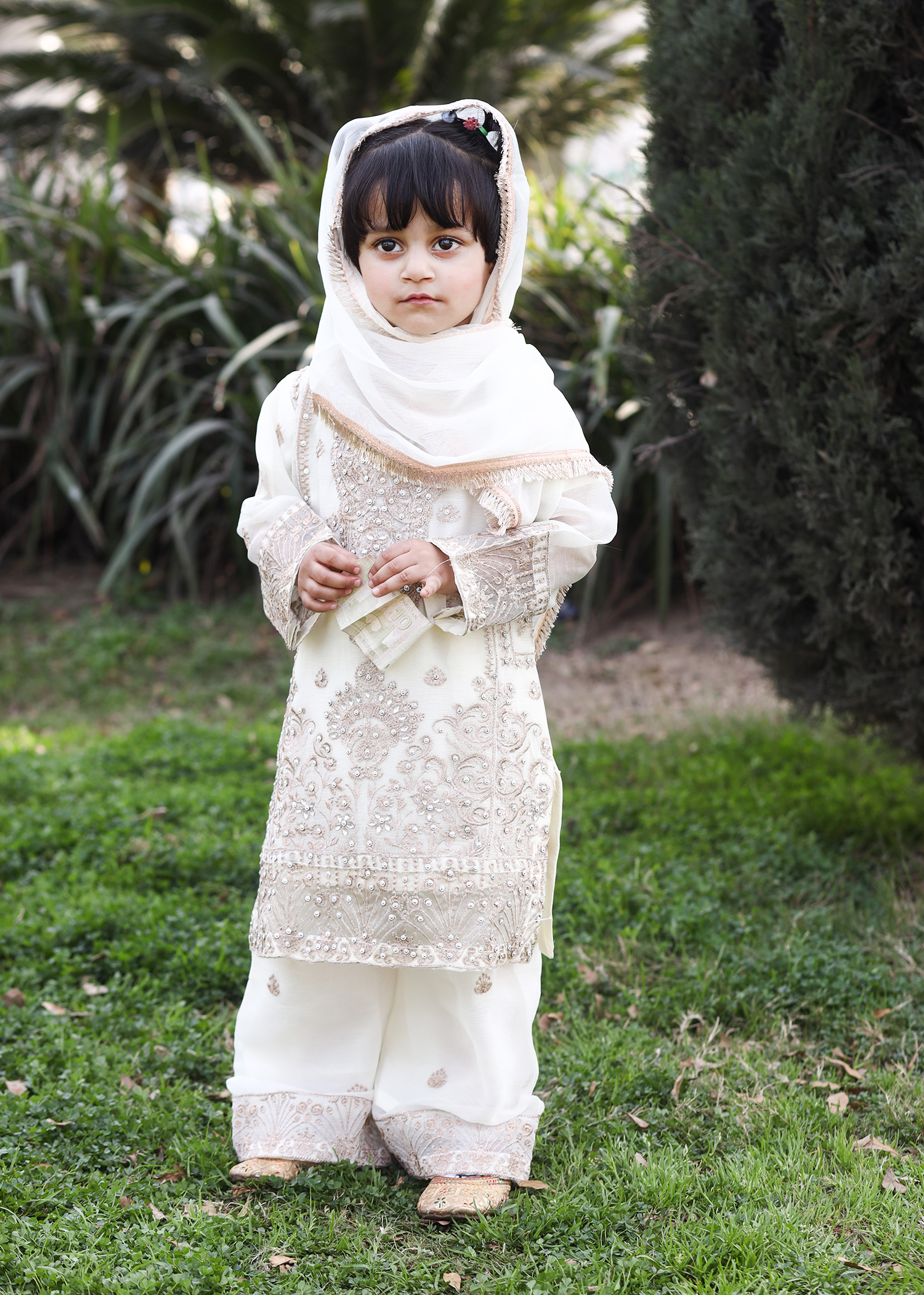 The soft ivory white shade gives a sophisticated and festive look, making it perfect for Eid, weddings, birthday parties, family gatherings, and special occasions. Lightweight and breathable, this chiffon kurta set ensures comfort while maintaining a luxurious appearance.